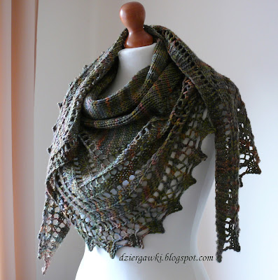 Też bardzo popciągająca, intrygująca i już zachęcająca do nowego dziergania. Widzę, że "szpicom-ząbkom" nadałaś więcej samodzielności i to też dodaje chustce szyku. Trochę mi włóczki zabrakło na wykończenie Clivii nr1 i dlatego zaciągneło się wykończenie. Ale już włóczka dokupiona, kawałek sprułam, aby całość powiększyc i mam zamiar , że na spotkanie wiosny prawdziwej zdążę. Pozdrawiam i życze moc inspiracji i udanych projektów.